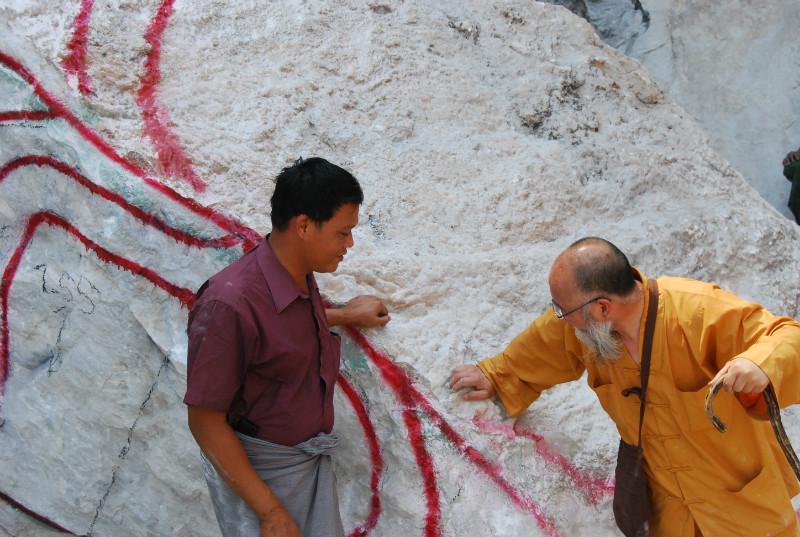 慈公老上师的白玉宝塔自去年下半年完成塔样雕造、运回慈恩寺鉴定以后,开始在缅甸白玉矿山开采大玉材。近日,智渡法师不顾脚伤未愈亲自到缅甸白玉矿山,视察取材情况,并作必要指正。 这一老上师塔分在三个矿区取材加工,分为塔顶、塔刹、塔鼓、塔盘、塔座等,其中塔顶、塔刹、塔鼓各自独立造型,塔盘、塔座等为了运输不超重等因素,共分为八块雕造。据目前进度,估计今年10月底可以初步完成雕造、报关、启运。